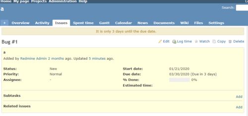上記の問い合わせに対応したサンプルコードを書いてみました。(これが求めているものなのかはちょっと怪しいかも...) 期日まで残り3日になったらチケット画面に警告を表示します。 設定内容 Path pattern: .* Insertion position: Bottom of issue detail $(…